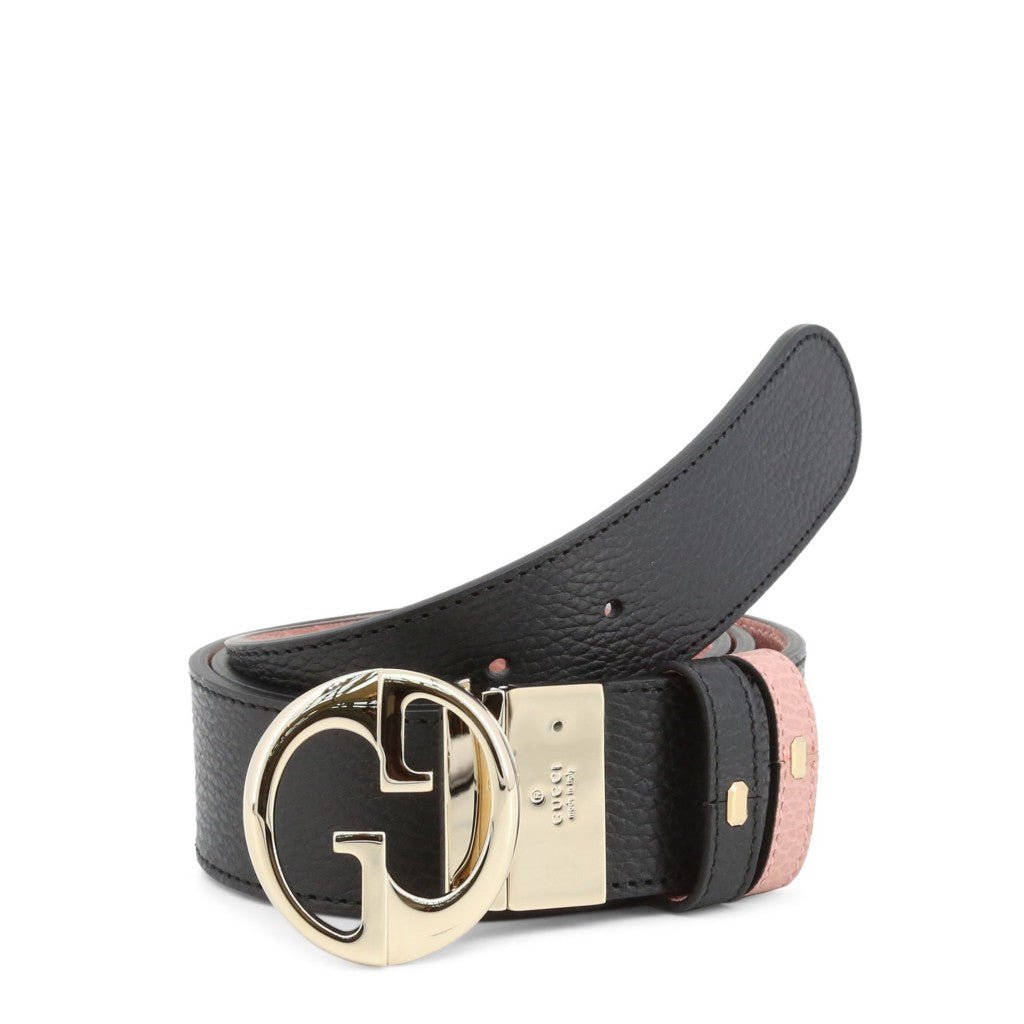 A reversible belt with black calfskin textured leather on one side and pink leather on the reverse. Finish with an interlocking G buckle in gold tone.