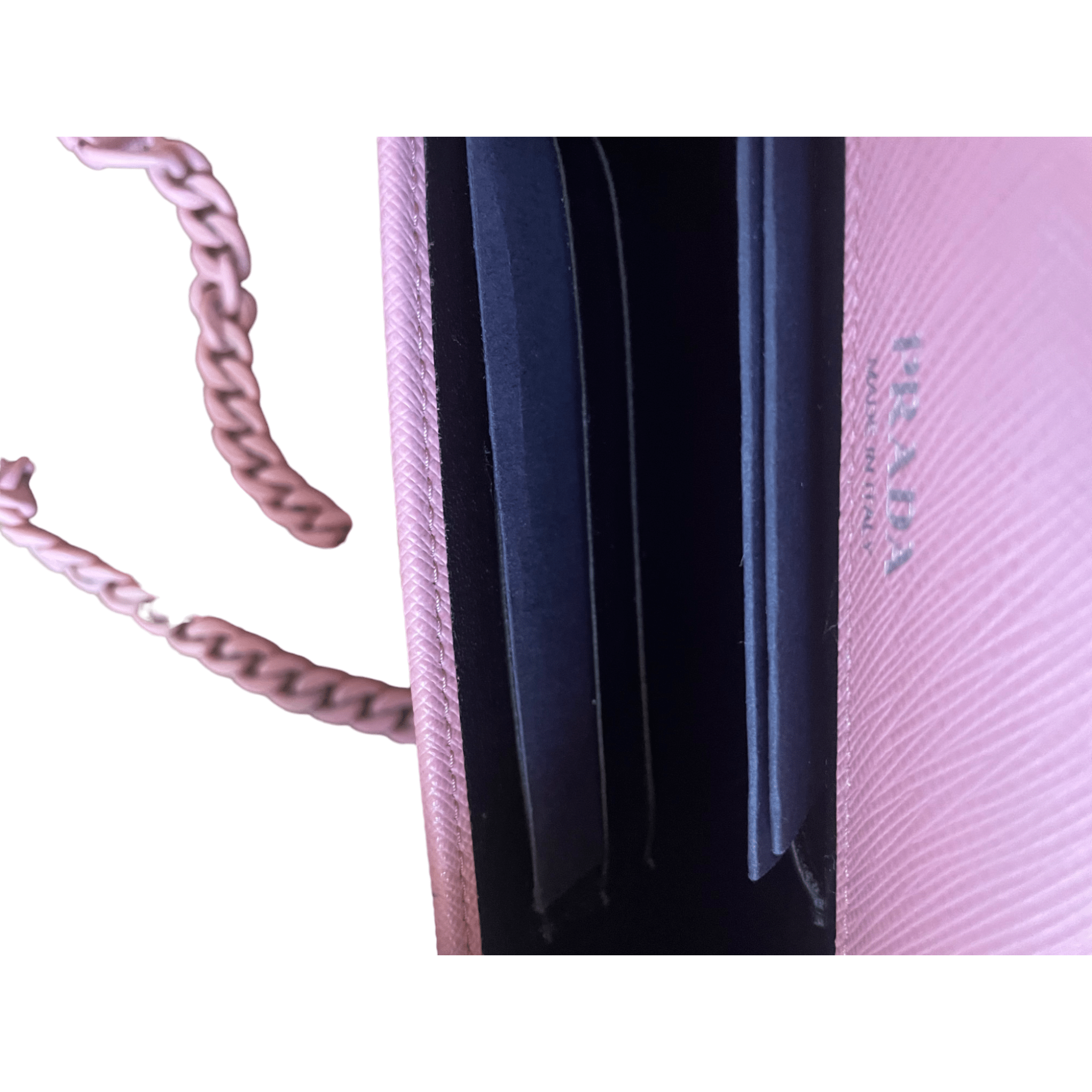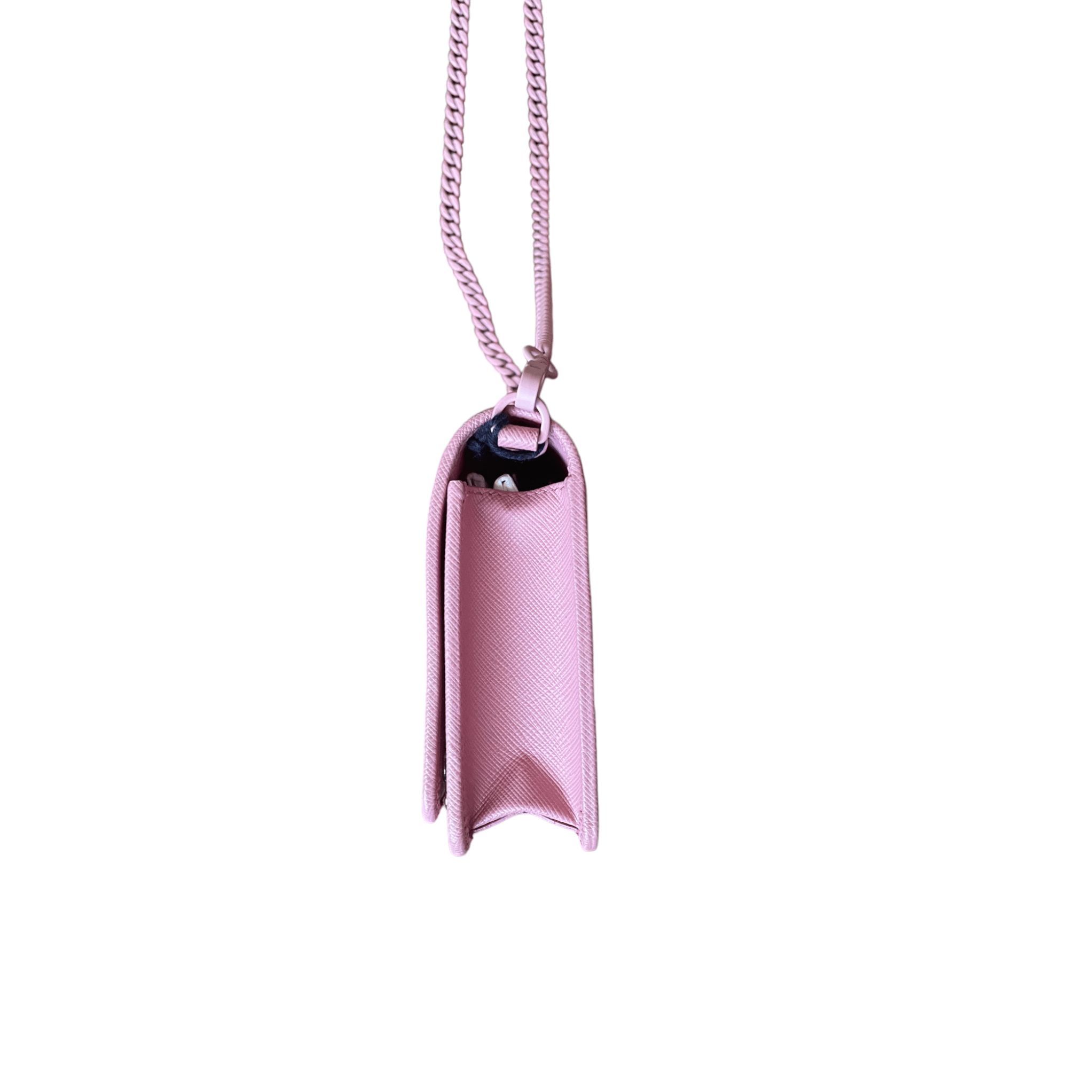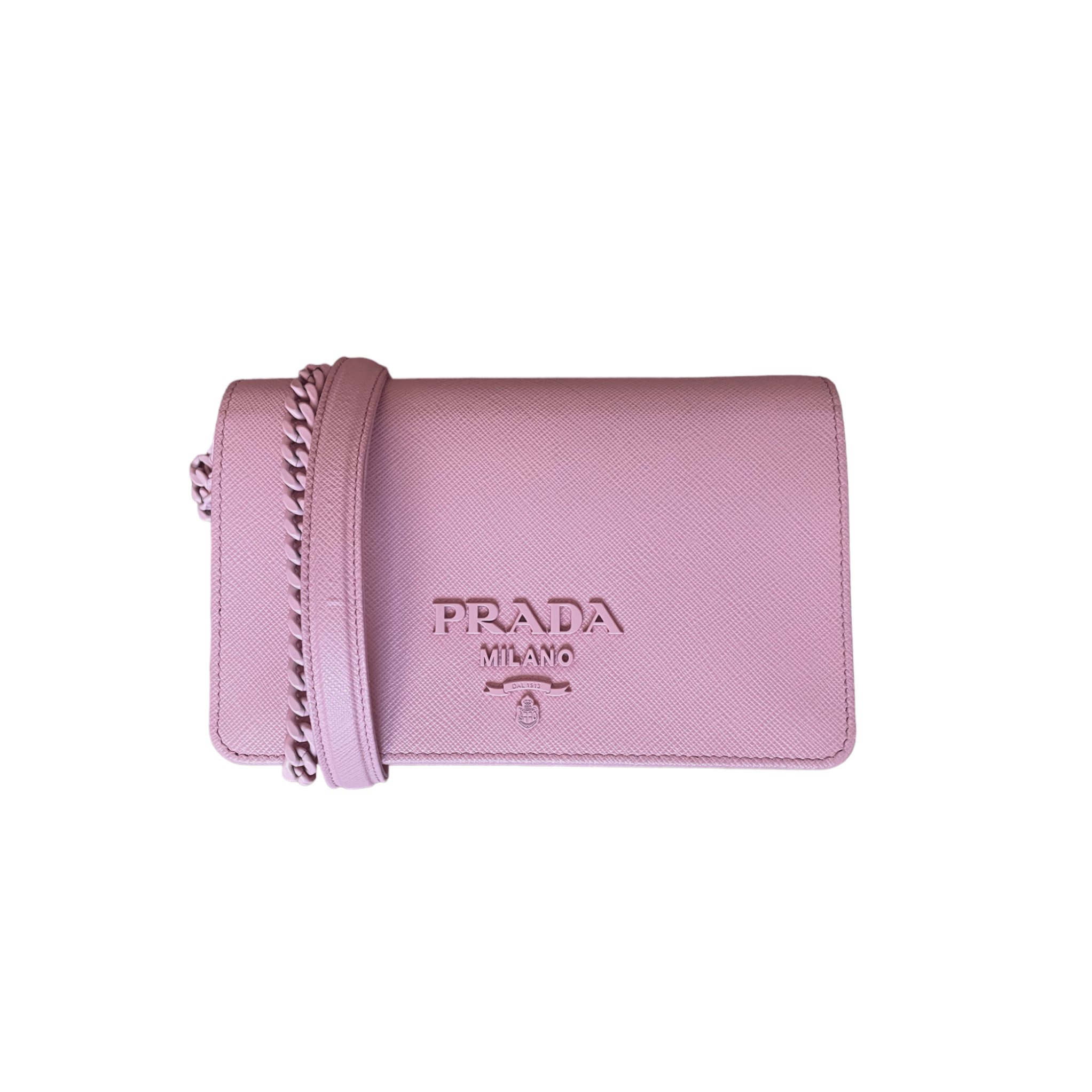 This mini bag by Prada is a must-have piece for carrying your essentials in style. It features a tonal Prada logo on the front and a tonal chain strap matching the bag's color. The bag opens to a black nappa interior with one patch pocket and three card slots. Made in Italy by Prada.