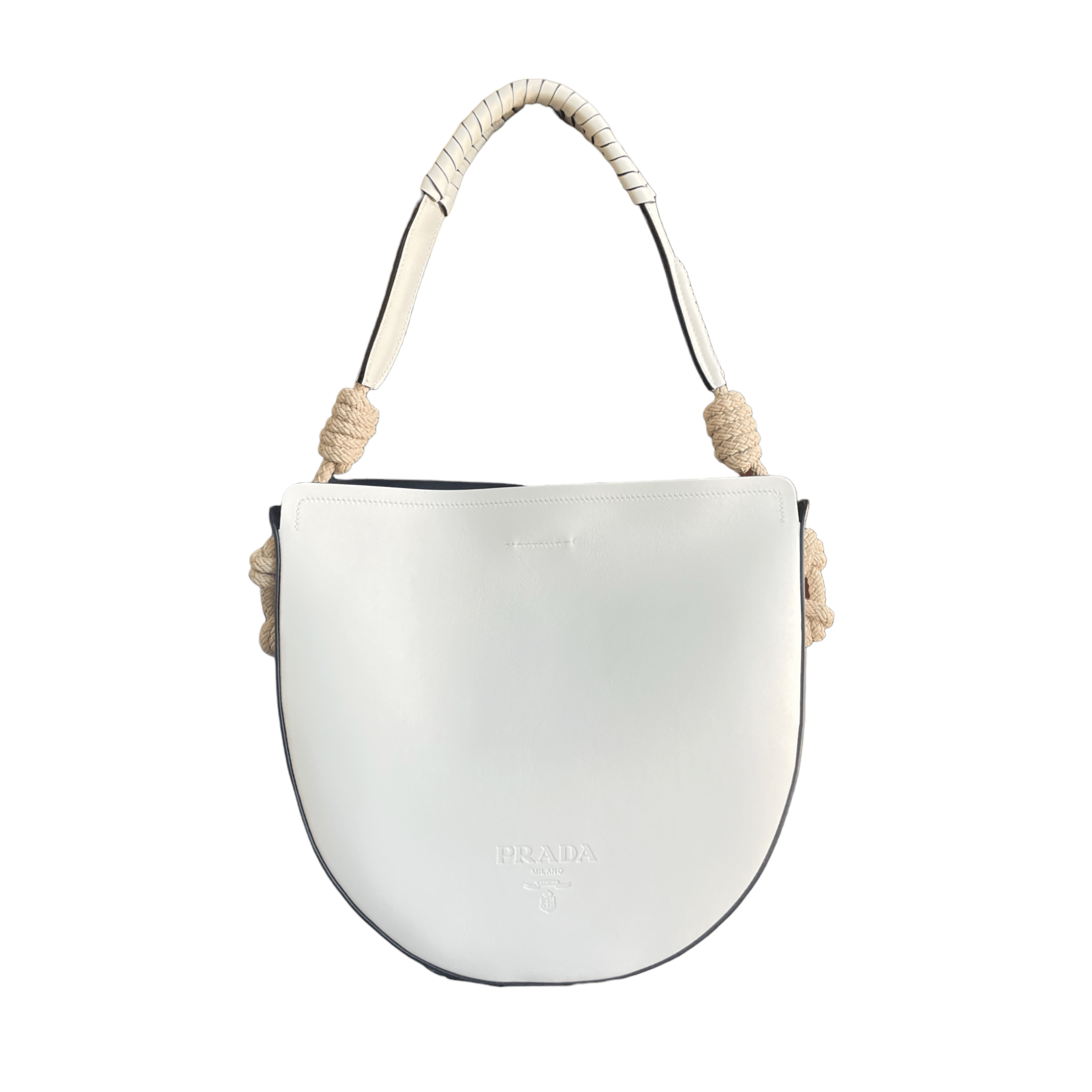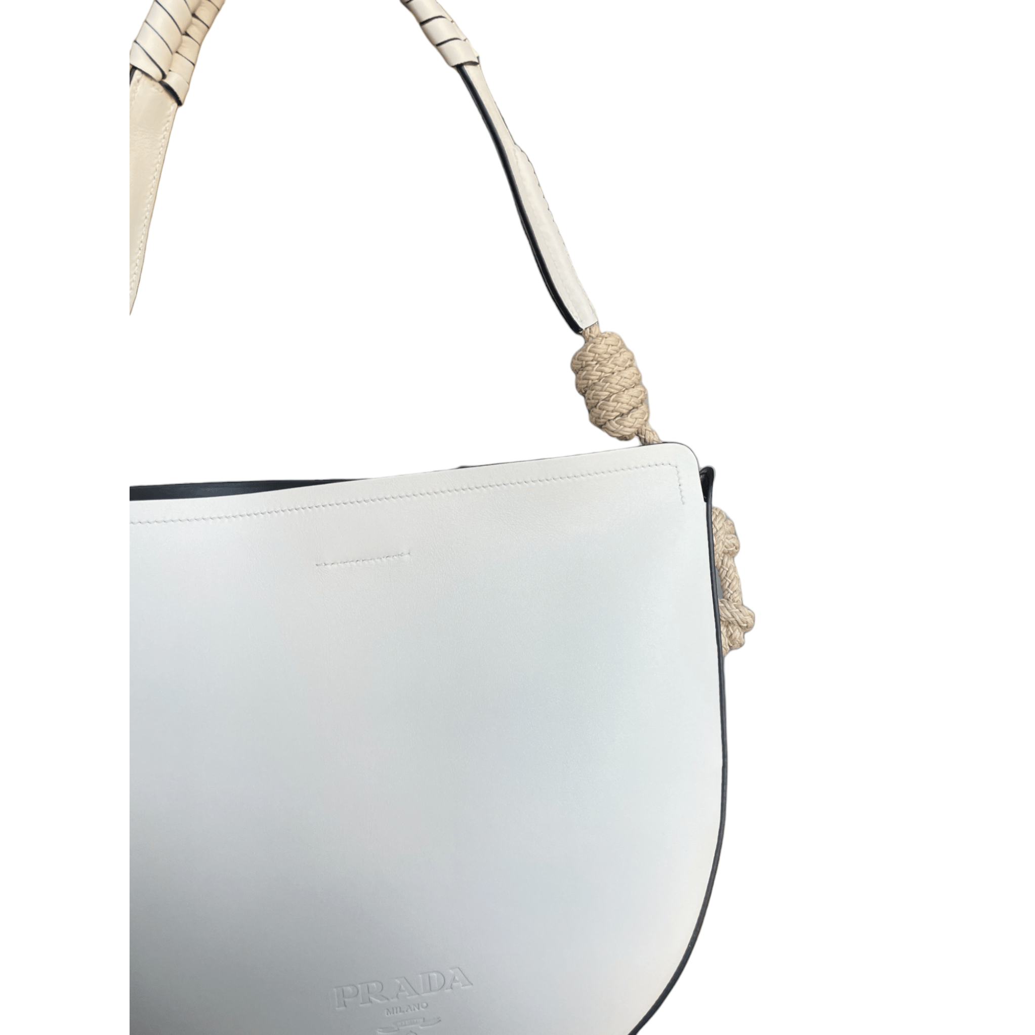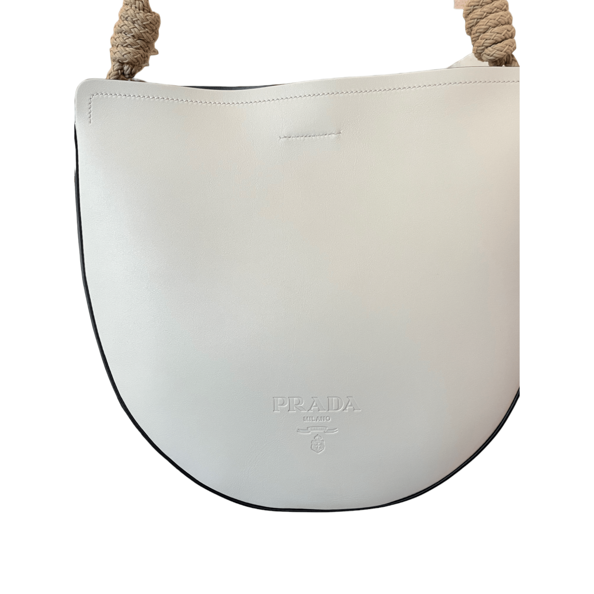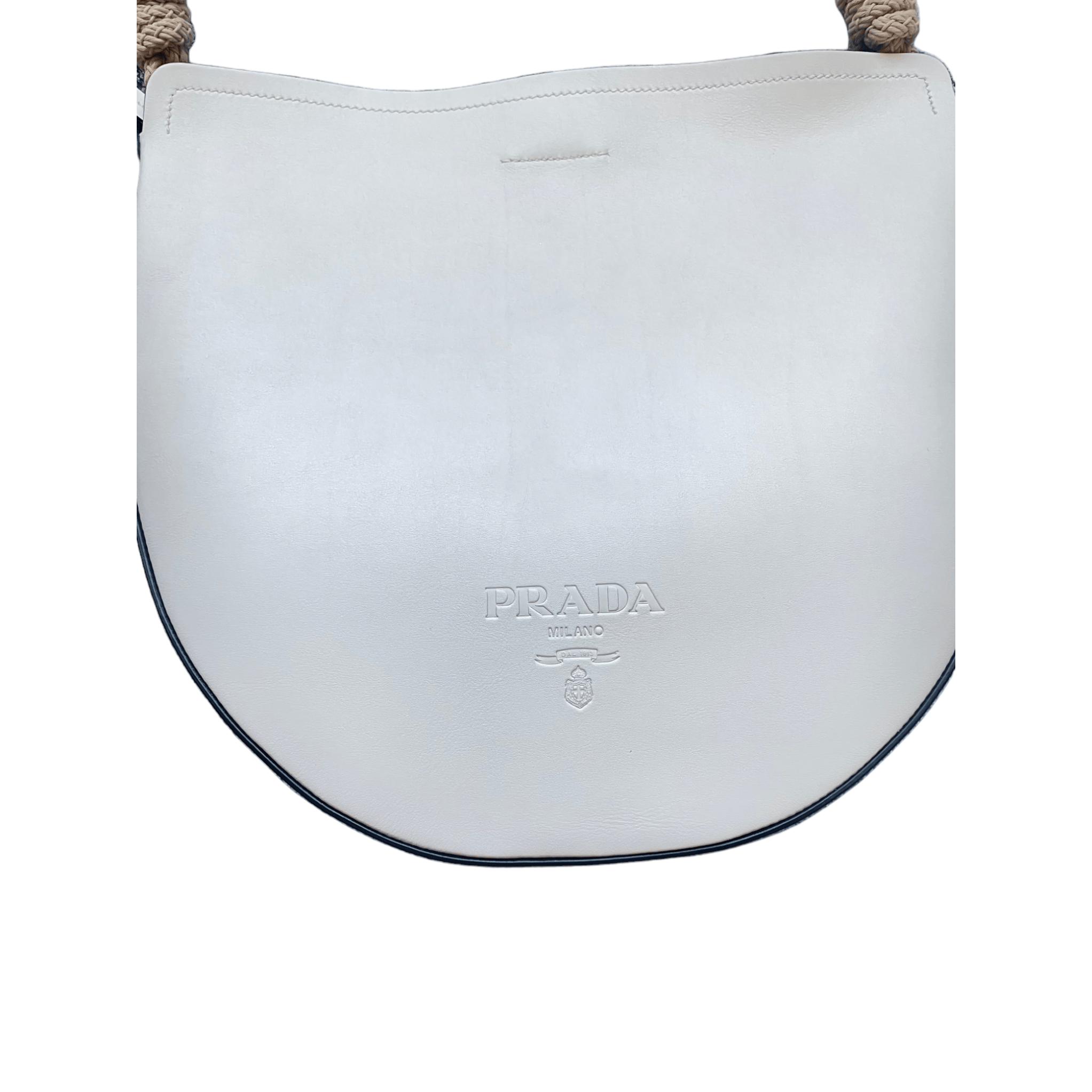 Woven cord lends coarse texture contrast to the smooth leather construction of this curved Prada design. Curling around the handle before giving way to a braided feature, the welcome simplicity of these additional details completes this versatile design. Made in Italy by PRADA