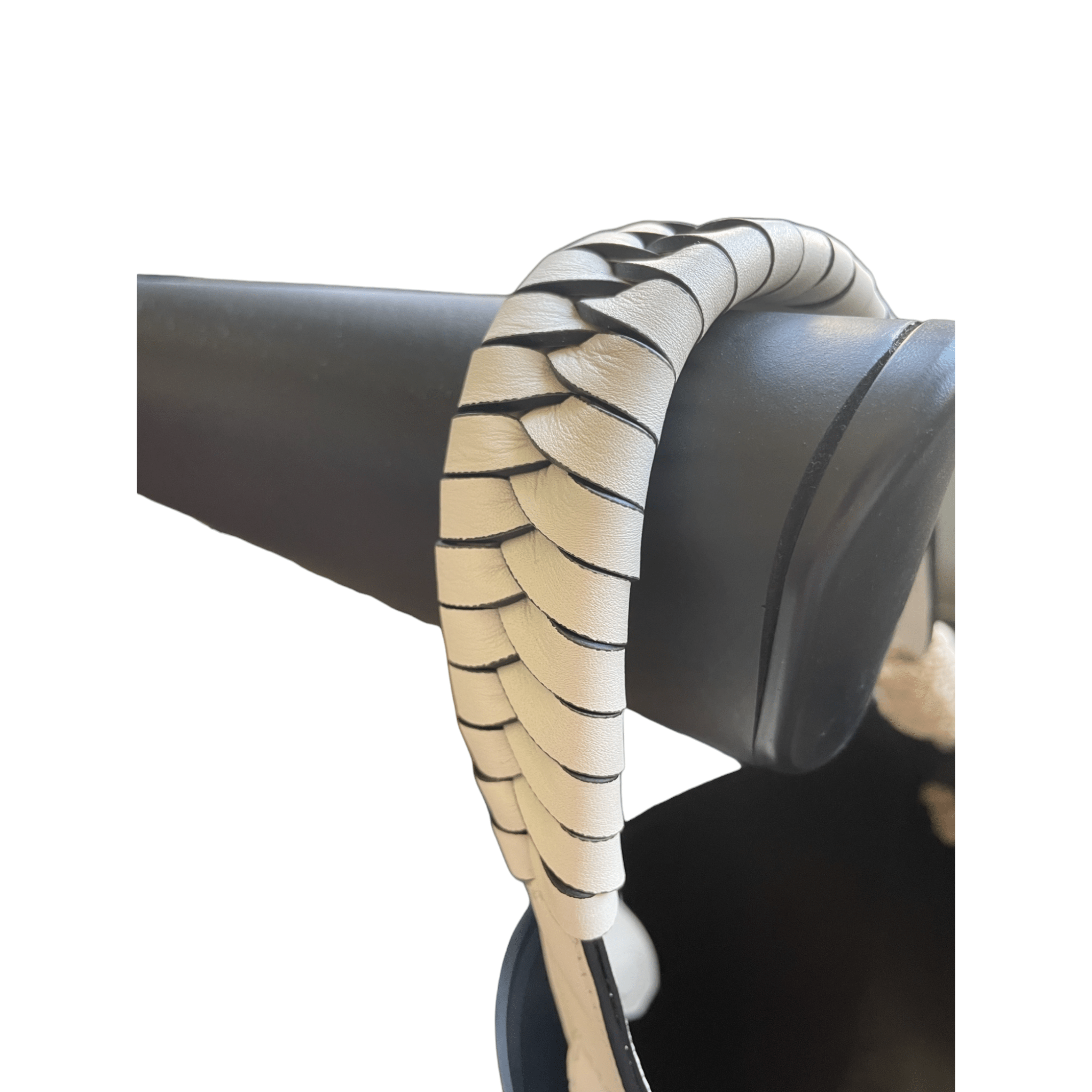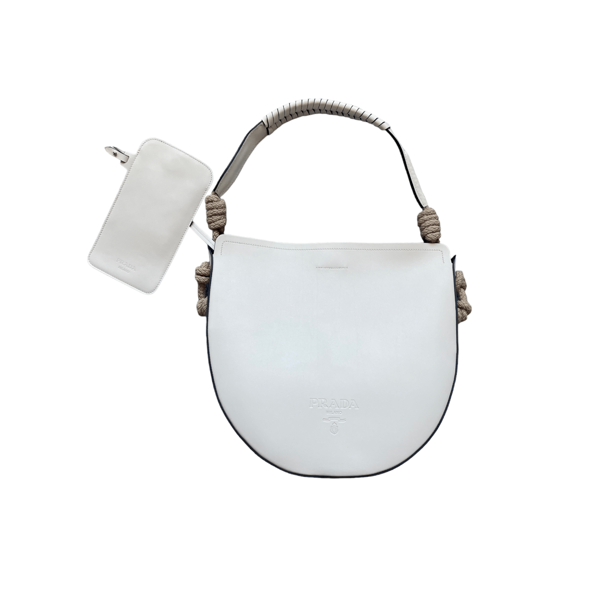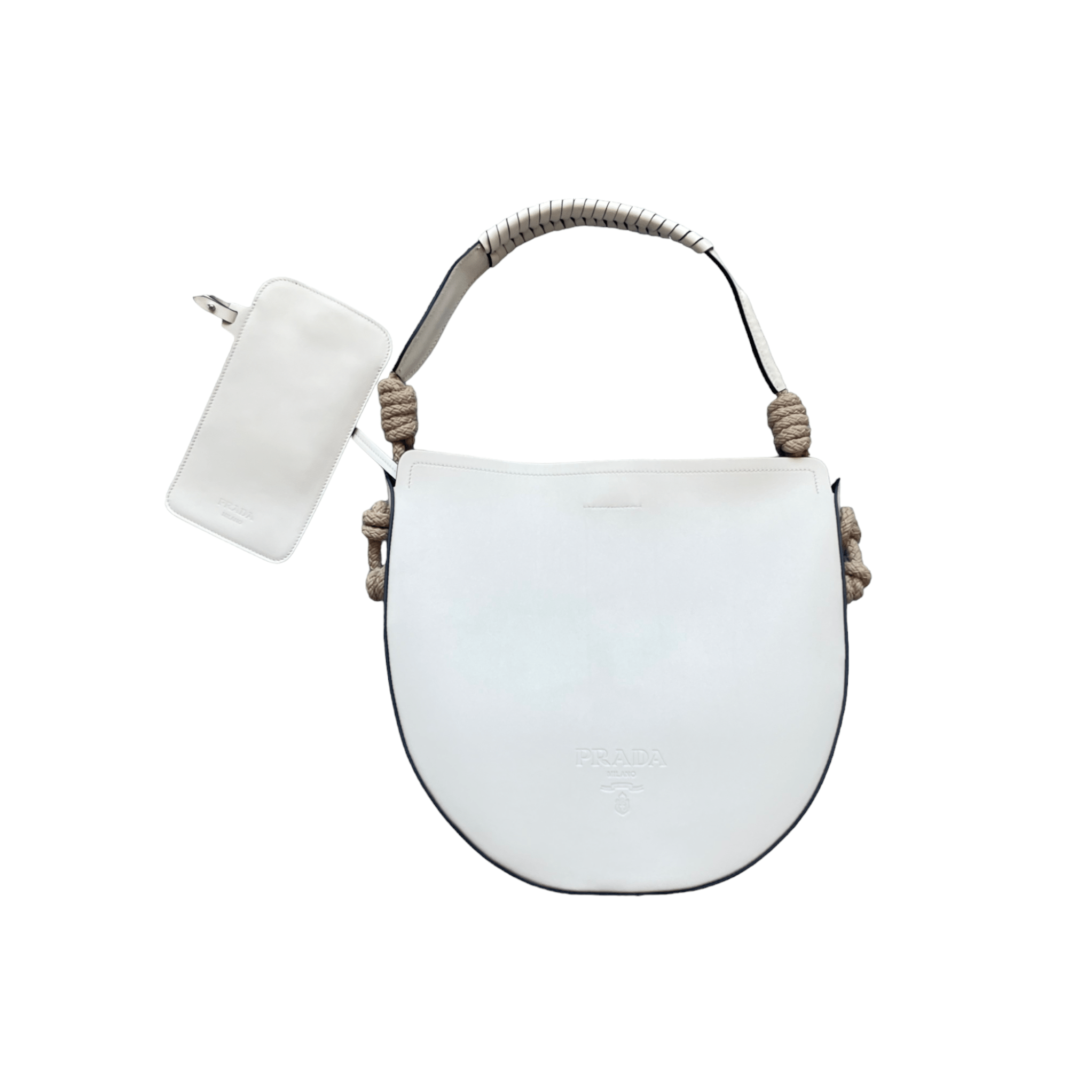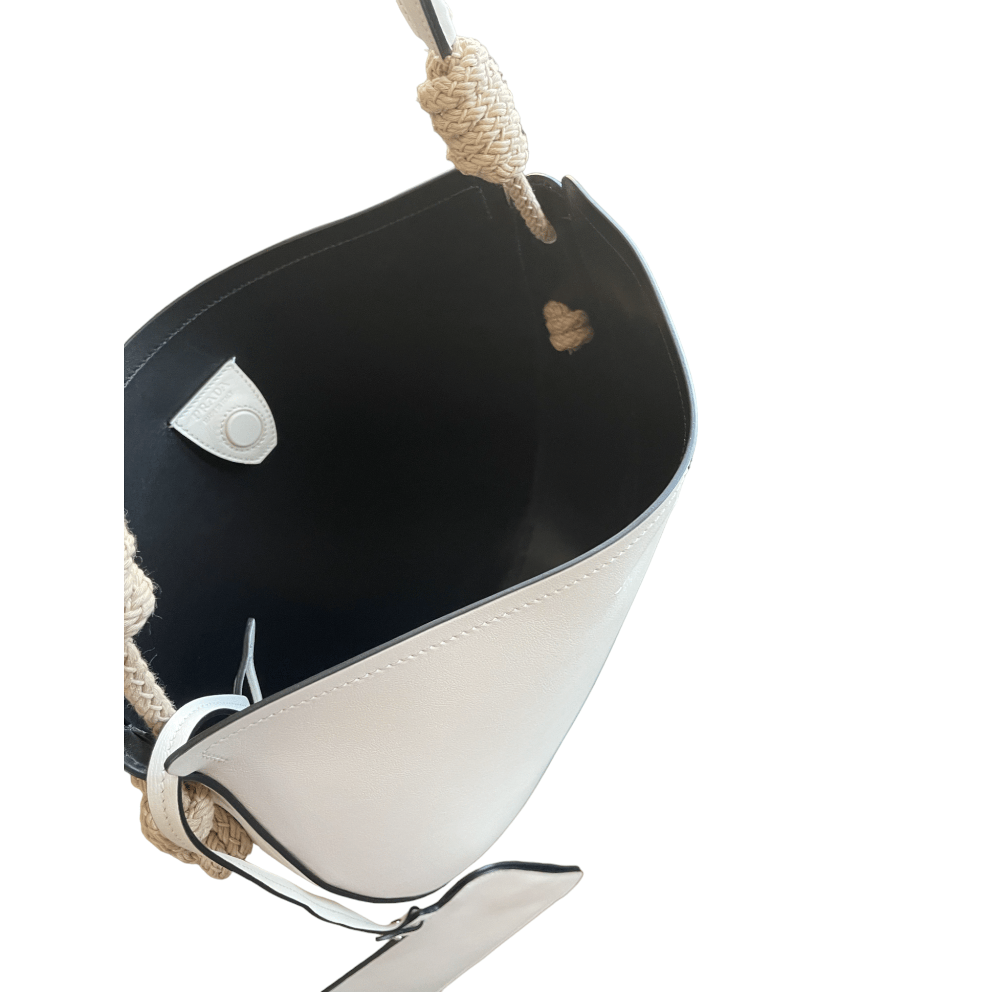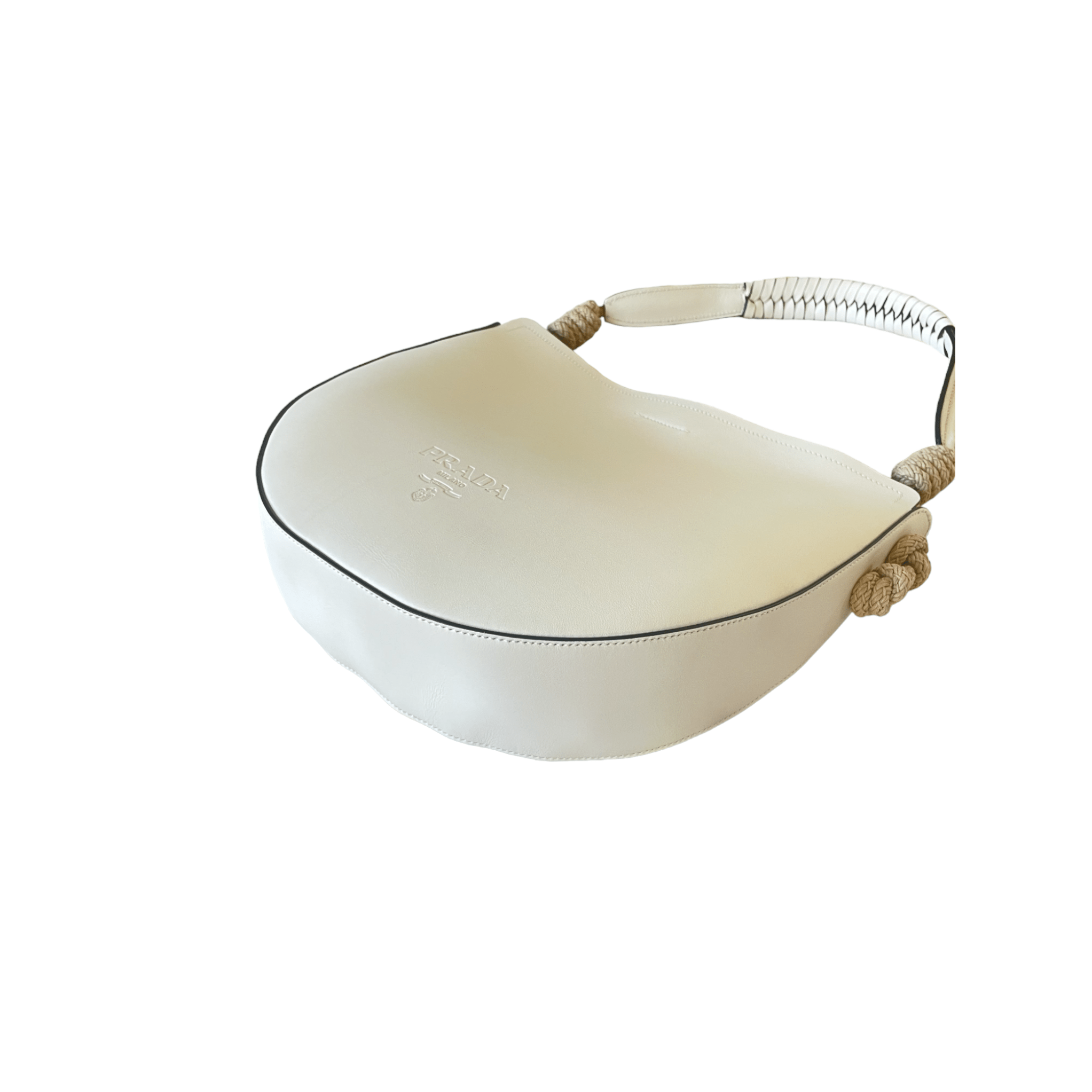 Woven cord lends coarse texture contrast to the smooth leather construction of this curved Prada design. Curling around the handle before giving way to a braided feature, the welcome simplicity of these additional details completes this versatile design. Made in Italy by PRADA