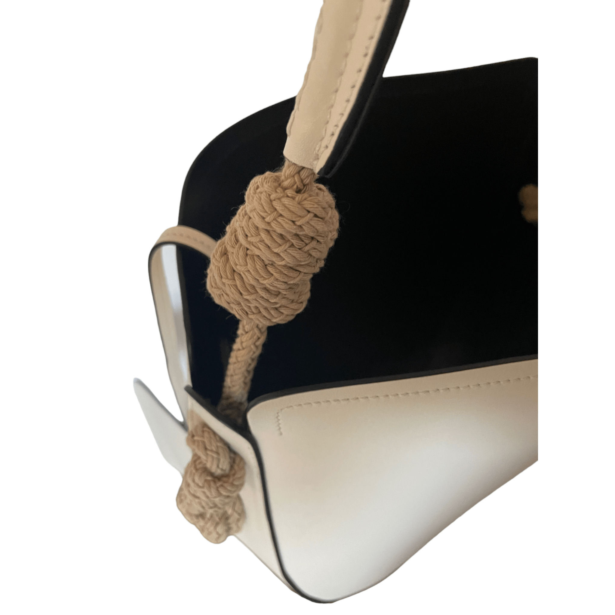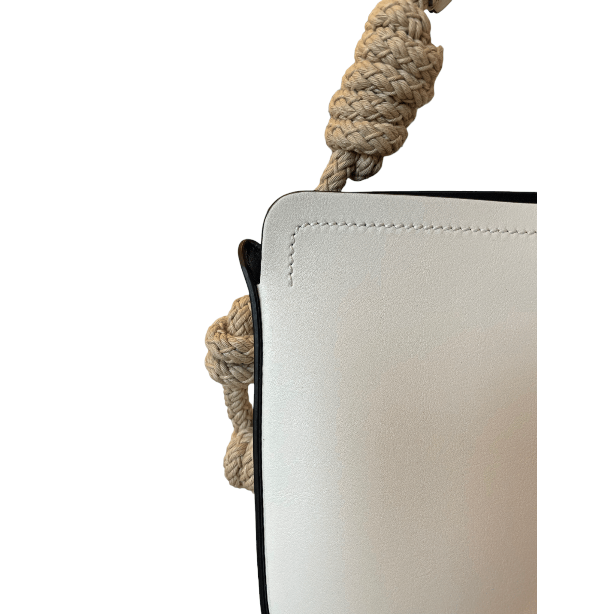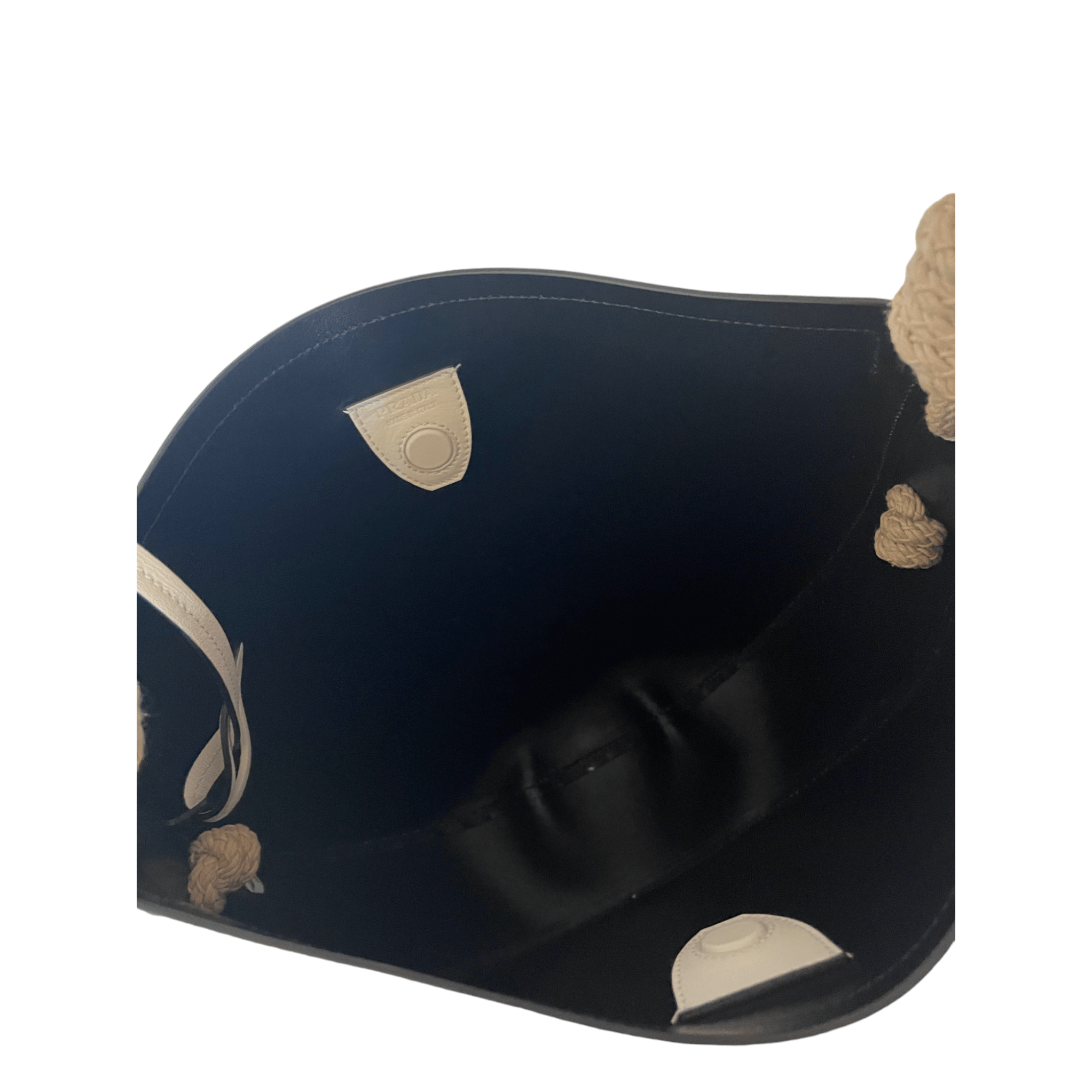- Leather and woven cord handle, hot-pressed logo on the front, magnet closure, Nappa leather interior with removable leather sleeve.