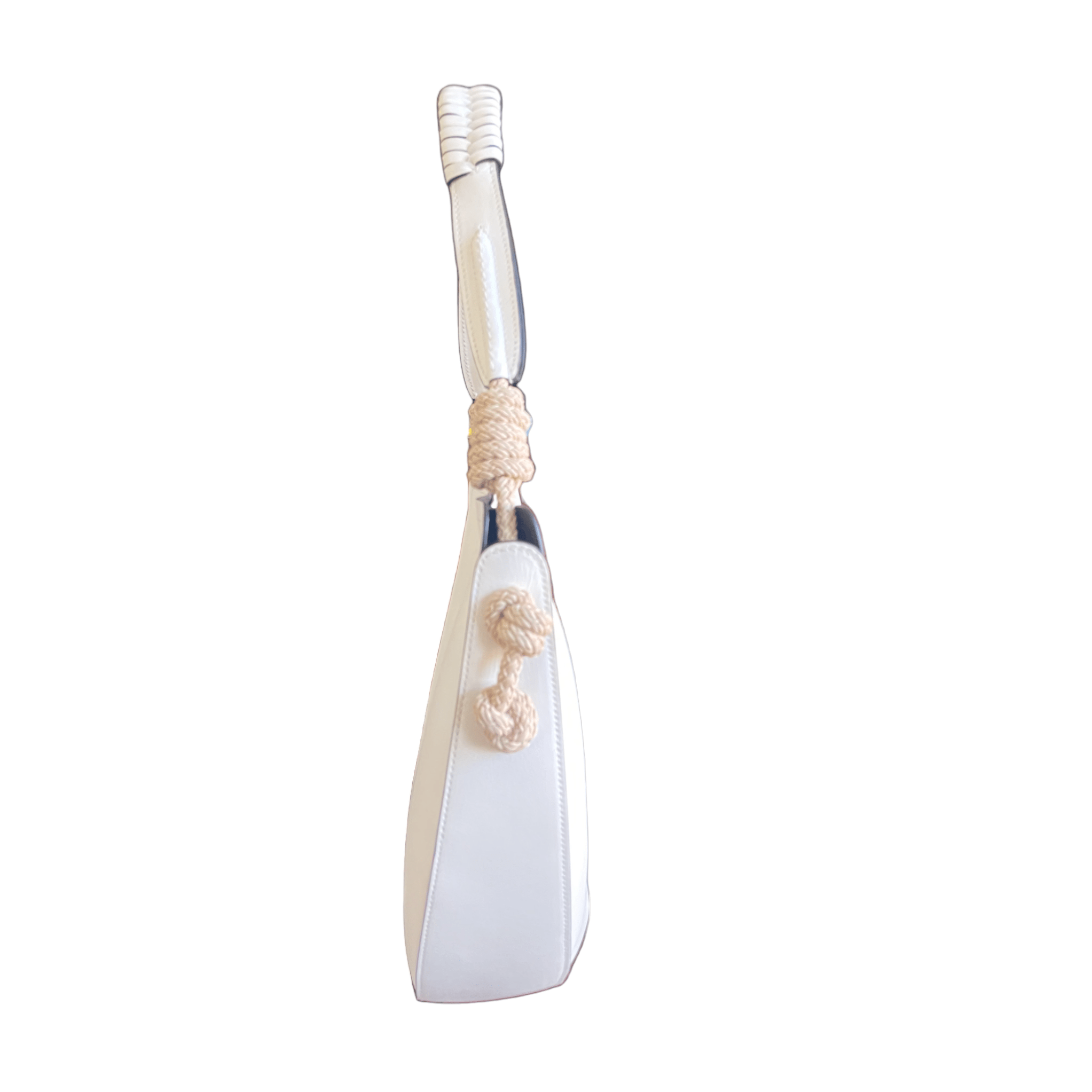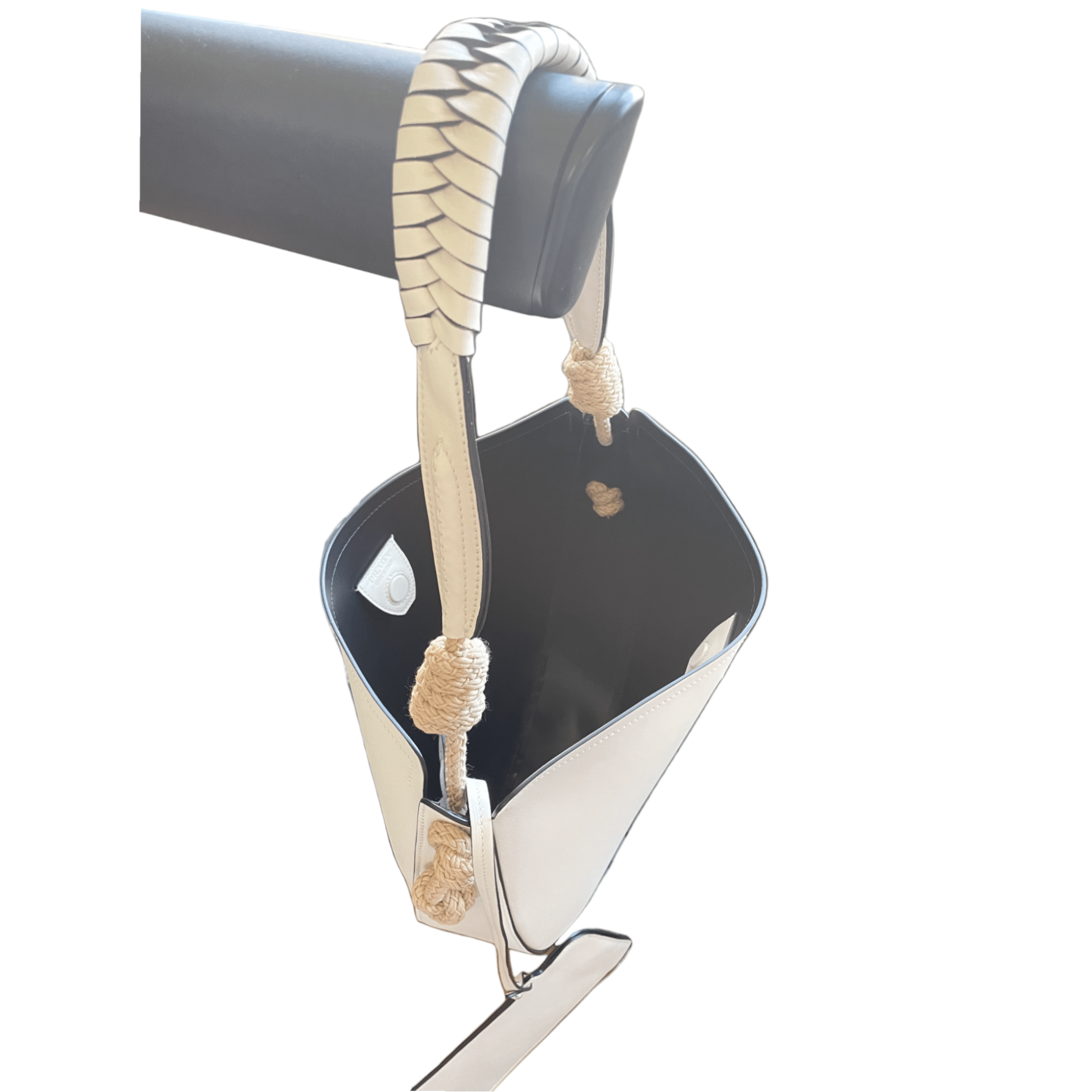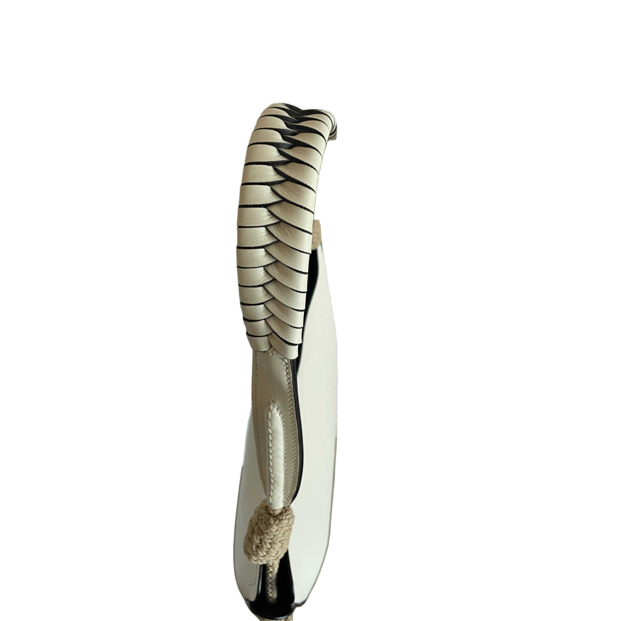 - Leather and woven cord handle, hot-pressed logo on the front, magnet closure, Nappa leather interior with removable leather sleeve.